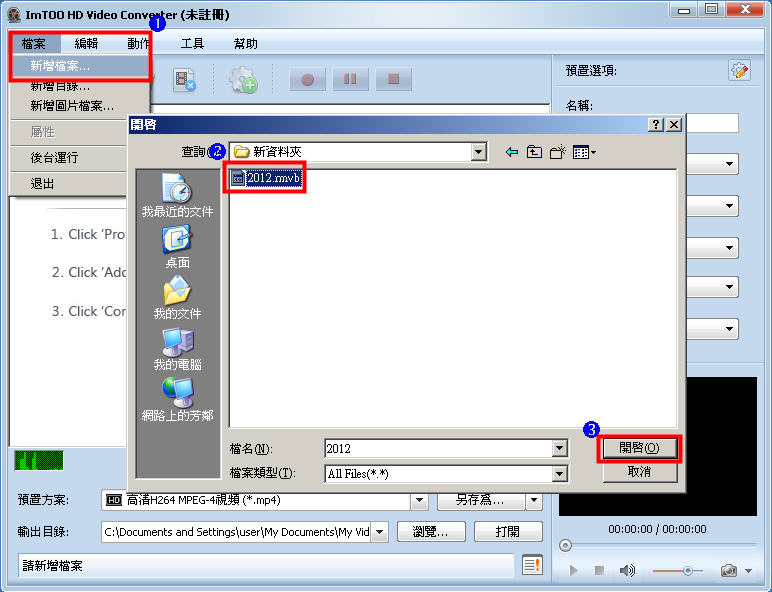 1.點擊"檔案"==>"新增檔案" 2.選擇欲轉檔的影音檔 3.點擊開啟