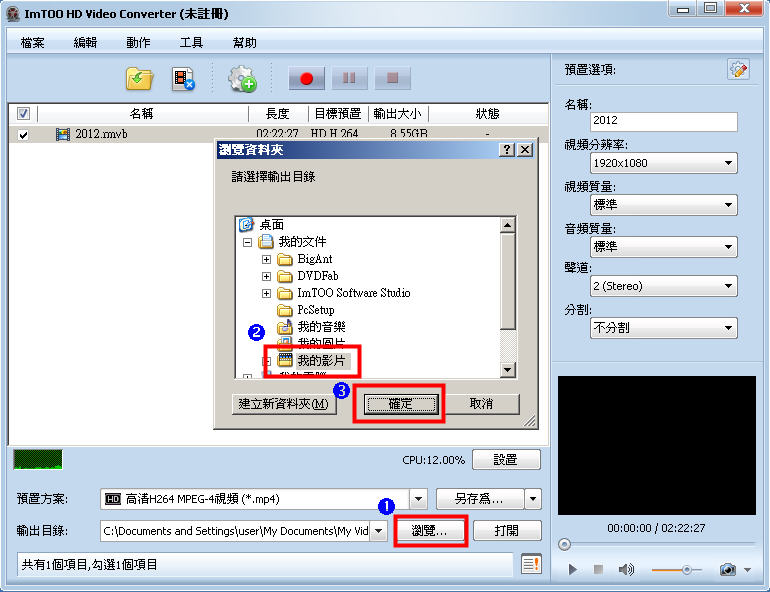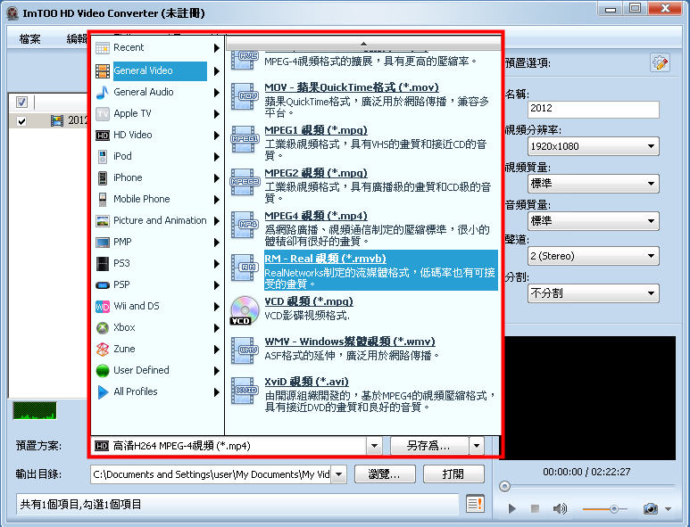 將RMVB影片檔案格式轉換成MP4的影片檔案格式(ImTOO HD Video Converter)