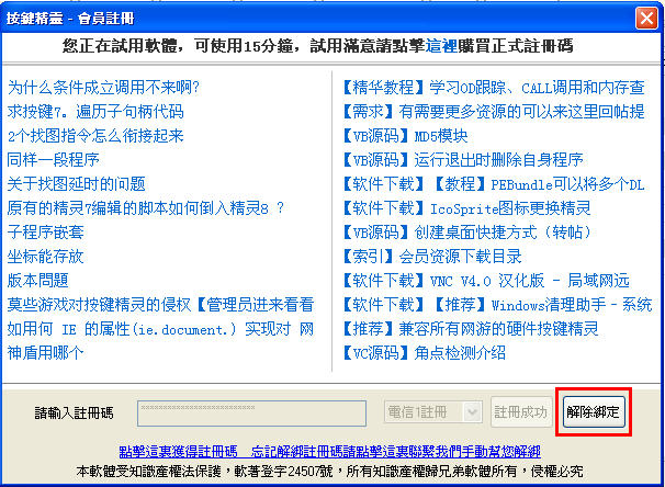 按鍵精靈的註冊碼是綁定電腦的,如果換了機器使用,需要在之前電腦上解除綁定。