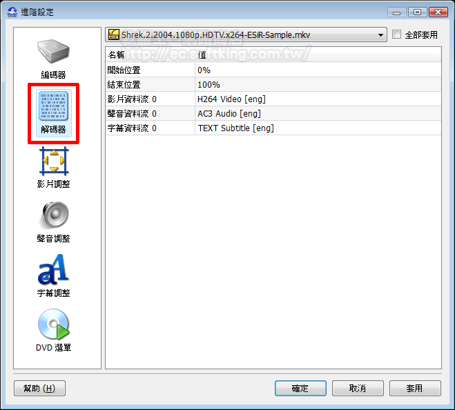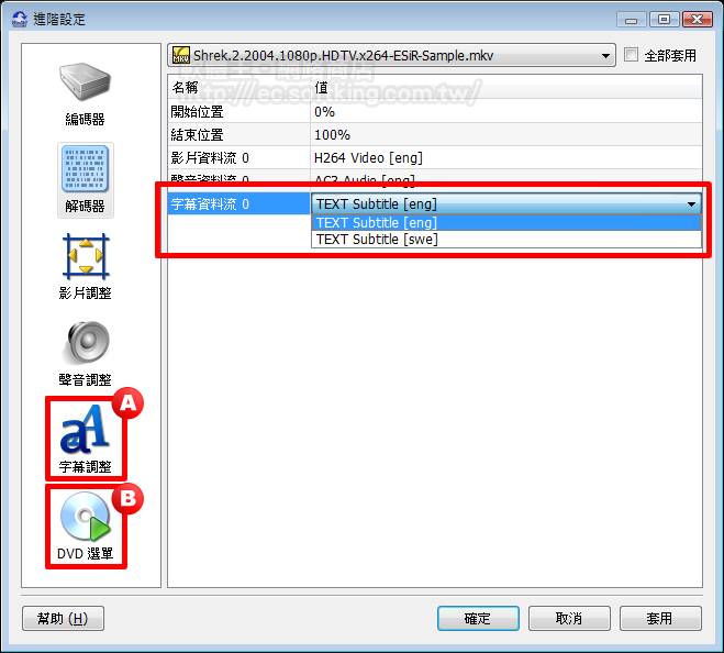 進入解碼器之頁面後,我們就要開始設定字幕語言了。以本例來說,該 MKV 包含了兩種字幕,分別是「英文(eng)」以及「瑞典語(swd)」,而我們選擇了英語字幕。 除此之外,以下功能: