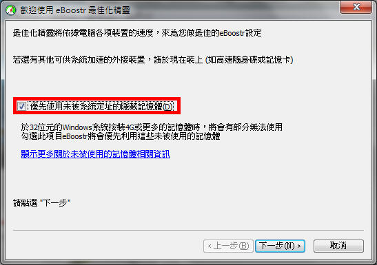 勾選"優先使用未被系統定址的隱藏記憶體" (於32位元的Windows系統安裝4G或更多記憶體實,將會有部分無法使用勾選此項目eBoostr將會優先利用這些未被使用的記憶體)