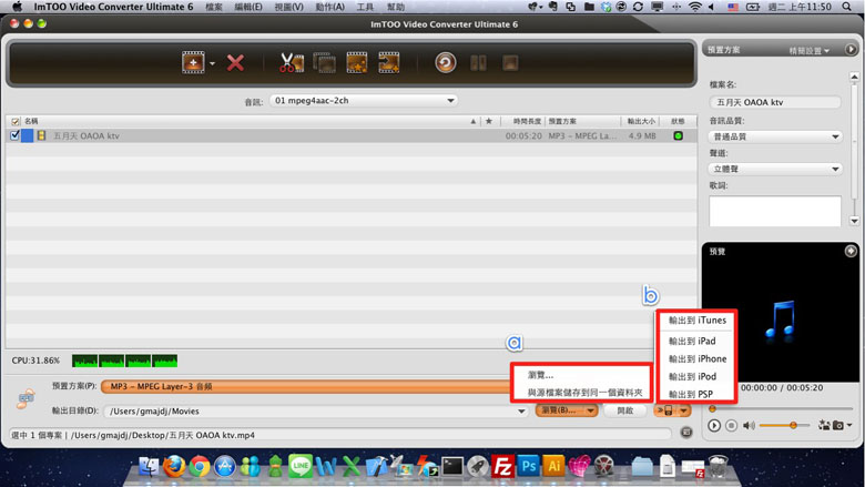 a:瀏覽-設定存放路徑(可自行指定存放位置)。 b:裝置-設定輸出置iTunes或其他行動裝置。 在此選擇輸出到iTunes