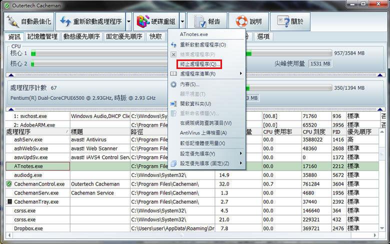 幫你關掉工作管理員無法關掉的視窗與程式及調整程式優先順序。(CacheMan 記憶體管理員 )