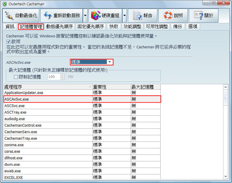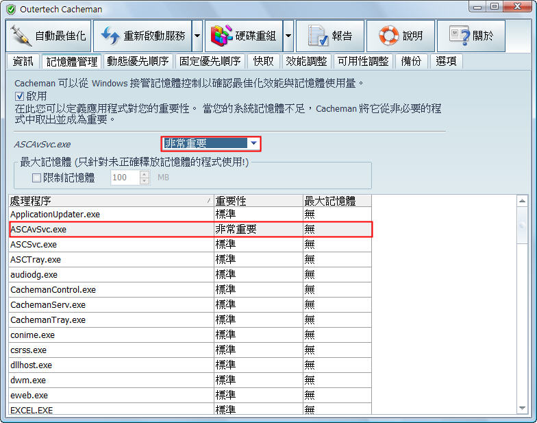 點選記憶體管理,選擇要調整的程式項目,提供標準、非常重要、重要、較不重要及不重要五種選項,來滿足當下的需要。
