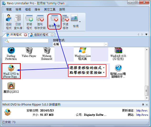 開啟軟體選擇要移除的程式,點擊移除安裝按鈕。如圖示。