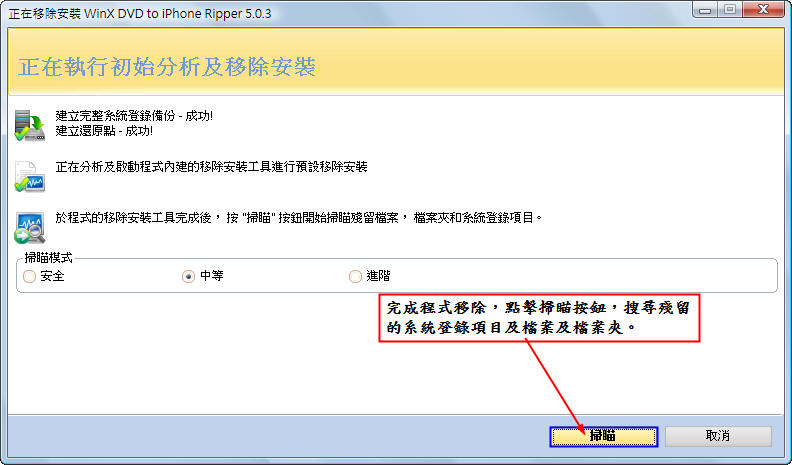 進行初始分析、相關資料備份及完成程式移除。如圖示。
