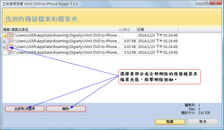 刪除殘留的檔案及檔案夾,完整程式移除。如圖示。
