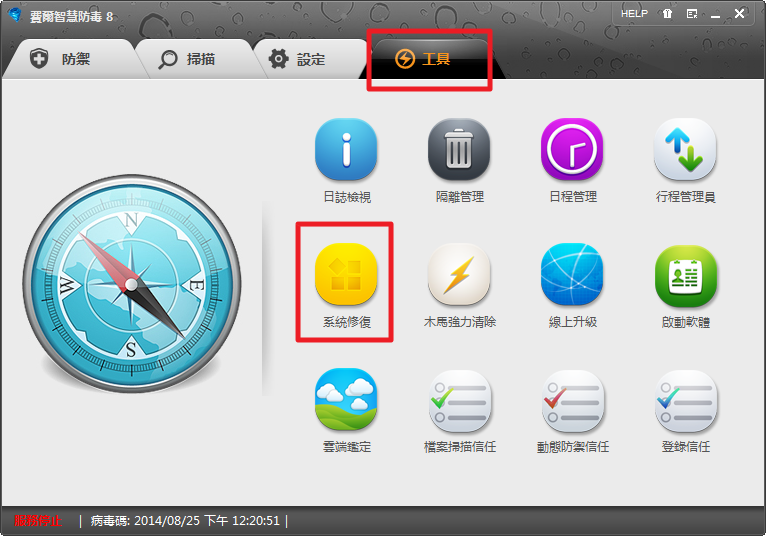 如果未下載安裝費爾智慧防毒,請先至以下網址下載安裝。 http://ec.softking.com.tw/sale/dl.asp?id=730 如果已經裝了費爾智慧防毒,點一下上方的『工具』,再點其中的「系統修復」。