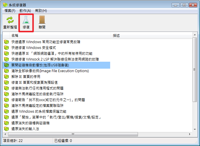 找到『關閉磁碟的自動播放(包括USB隨身碟)』,可以直接在該項目上連按兩下,或按一下之後,再點上面的『修復』。