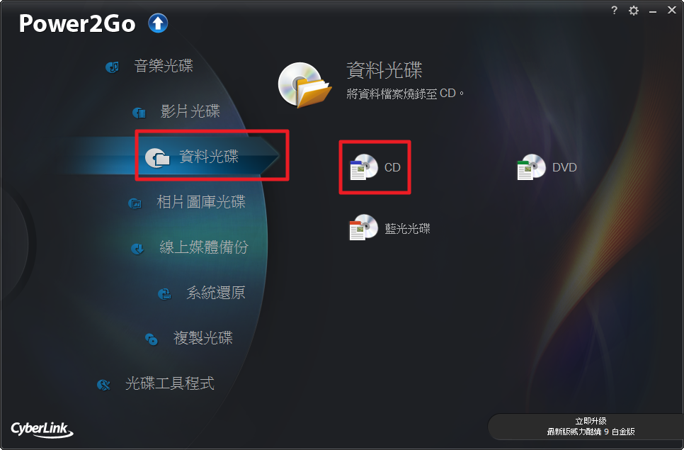 開啟威力酷燒後,滑鼠移到左邊的『資料光碟』,可以燒錄到三種不同的光碟類型上,我們選擇了『CD』。