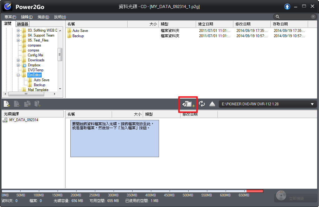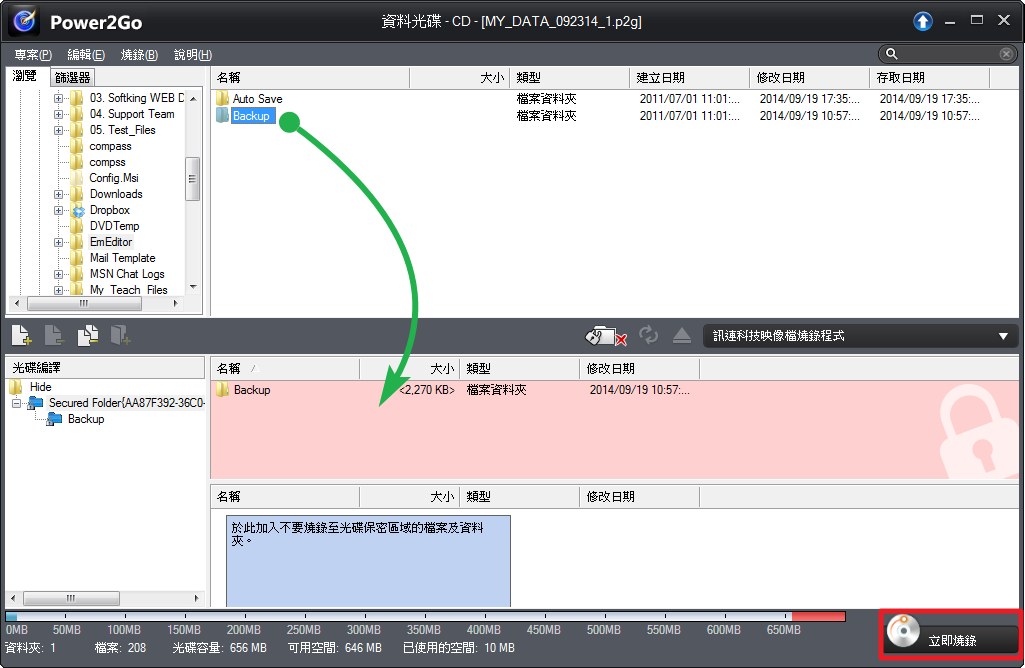 新增了『加密區』後,我們可以發現下半部多出了紅色區域,這裡就是加密區,這裡的所有檔案和資料夾,都會受到密碼的保護,如果沒有正確的密碼,則無法正常存取檔案內容。 要將檔案或資料夾加入加密區,可以用拖曳的方式加入。 而原本白色區域,我們仍然可以加入一些檔案,它屬於『公開區』,不受密碼保護,任何人都可以正常存取檔案內容,且不需要密碼。 最後,再按下【立即燒錄】。