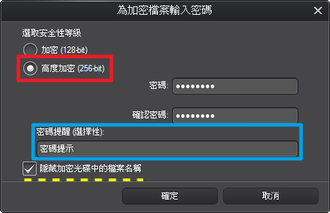 加密等級,我們採用較高等級 256-bit 加密。 『密碼提示』,主要是用於解密時,提醒我們密碼之用,這做為日後忘記密碼時,回想密碼的一段提示文字。