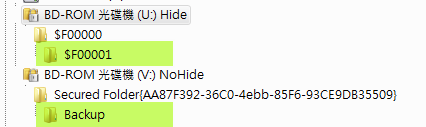 若勾選了『隱藏加密光碟中的檔案名稱』,以資料夾為例,若原本是『Backup』,那麼勾選後,它會以流水號的方式重新命名,檔案亦同。 如圖中,我們的光碟機 U,是勾選了『隱藏加密光碟中的檔案名稱』,可以發現原本的『Backup』資料夾會被命名為『$F0001』,而光碟機 V 沒有勾選『隱藏加密光碟中的檔案名稱』,其『Backup』資料夾則維持原本的名稱。