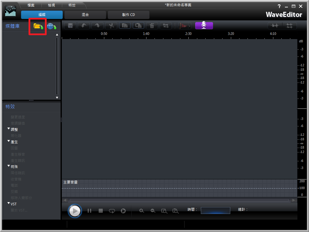 開啟 WaveEditor 之後,先把我們的音樂檔案匯入。目前支援 WAV、WMA 以及最常見的 MP3。