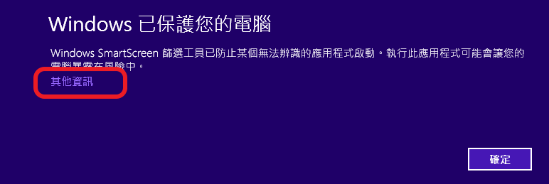 當我們要在 windows 8 系統安裝軟體時,常常會看到系統跳出這個「Windows已保護您的電腦」警告視窗,畫面上寫著「Windows SmartScreen篩選工具已防止某個無法辨識的應用程式啟動。執行此應用程式可能會讓您的電腦暴露在風險中。」。 此畫面是【SmartScreen 篩選工具】,它是 Windows 8 中的安全性功能,可幫助您防禦反惡意程式碼軟體尚未偵測到的新惡意程式碼;當您下載及執行之前從網際網路下載的應用程式時,【SmartScreen 篩選工具】會在此應用程式不知名或者可能有惡意時,使用有關應用程式評價的資訊來警告您。 當我們點擊〔確定〕之後,安裝程式便會自動停止而無法安裝軟體了。 此時,請點選如下圖中紅色框線中的的「其他資訊」。