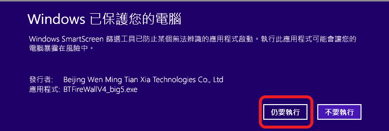 請點選如下圖中紅色框線中的的「仍要執行」。 當然您需要知道您所要安裝的這個軟體不會是病毒程式且是您所信任的軟體,如此才可安心安裝軟體。 點選後便可依一般安裝軟體的程序來安裝軟體。