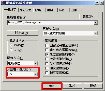 預設是不執行分片壓縮,所以「分割檔,位元組(V)」會呈現空白 預設有四種分片壓縮的大小,分別是「1,457,664 - 3.5"(約1.44MB)」「98,078k - ZIP-100(約100MB)」「650m - CD-650M(約650MB)」「700m - CD-700M(約700MB)」 有時內建的大小,並不是我們所想要的,所以我們可以自行輸檔案的大小。 在此例中我們設定成「3m(在WinRAR裡3m跟3M是不同大小的,等等會說明)」,來源檔案接近9MB,若以我們自訂的大小來看,WinRAR會自動幫我們分割成3個檔案。 而檔案的格式則為「檔名.part1.rar」「檔名.part2.rar」「檔名.part3.rar」...依此類推。 ※在WinRAR裡,最小的大小為1000個位元組(Bytes),而若用「K」或「M」則代表以1000為單位,例如:1K = 1000 Bytes;1M = 1000 KBytes。而若是用「k」或「m」則代表以1024為單位,例如:1k = 1024 Bytes;1m = 1024 KBytes。
