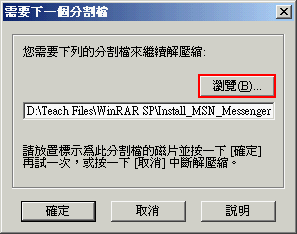 若我們在執行合併時,有其中一個分片壓縮檔是放在其他的資料夾,這時我們在執行合併壓縮時,就會有問題,這時WinRAR就會跳出一個視窗要我們選擇另一個分片壓縮檔的存放位置。 當跳出這個視窗時,我們只要點選「瀏覽(B)...」再去尋找並點選另一個分片壓縮檔即可。