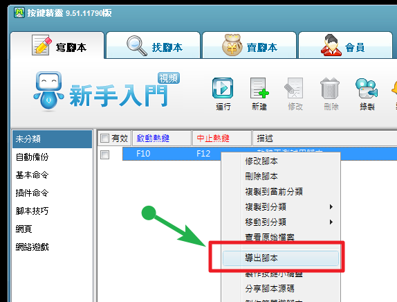 如果你想知道如何匯出按鍵精靈的腳本,你可以觀看以下文章: 『將按鍵精靈 9 的腳本移轉到全新的按鍵精靈 2014(匯入腳本)。』 http://ec.softking.com.tw/use/use.asp?id=334