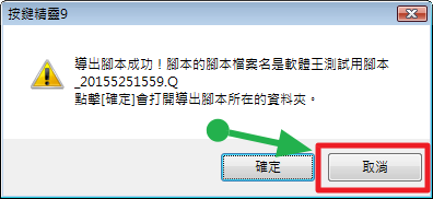 匯出成功之後,按鍵精靈 9 會出現如圖的訊息。如果按『確定』,會開啟匯出後的腳本,其所在的資料夾。但我們不需要檢視匯出的腳本,所以直接按【取消】即可。