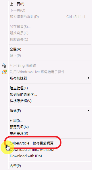 利用 CyberAricle 快速地儲存網頁內容-IE 瀏覽器。(網際知識管家 CyberArticle )