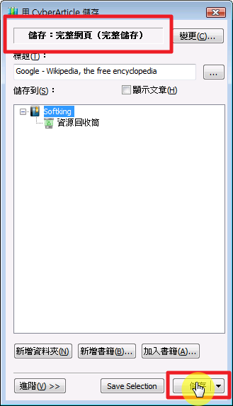 然後,你就會看到 CyberArticle 的儲存詢問視窗。如果沒有事先啟動 CyberArticle,也沒有關係,這個畫面仍然會看到。也就是說,我們要儲存網頁時,可以不需要先啟動 CyberArticle。 除非有特殊需求,可以按下左下的【進階】,做更進一步的細部設定。 但正常來講,只要最上方是選擇至「儲存:完整網頁(完整儲存)」,其儲存的結果,通常都是令人滿意的。 最後,只要按下右下的【儲存】即可。