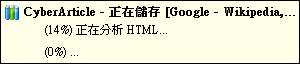 儲存的速度及所花費的時間,會取決於網路速度、網頁內容……等因素。 當 CyberArticle 在儲存時,電腦右下角的系統列會出現一個忽大忽小的磁片圖示,這代表 CyberArticle 正在幫我們分析網頁,並儲存其內容。 滑鼠移動到讓圖示上,可以看到目前 CyberArticle 的工作進度。 當所有工作完成時,這個磁片圖示會自動消失。