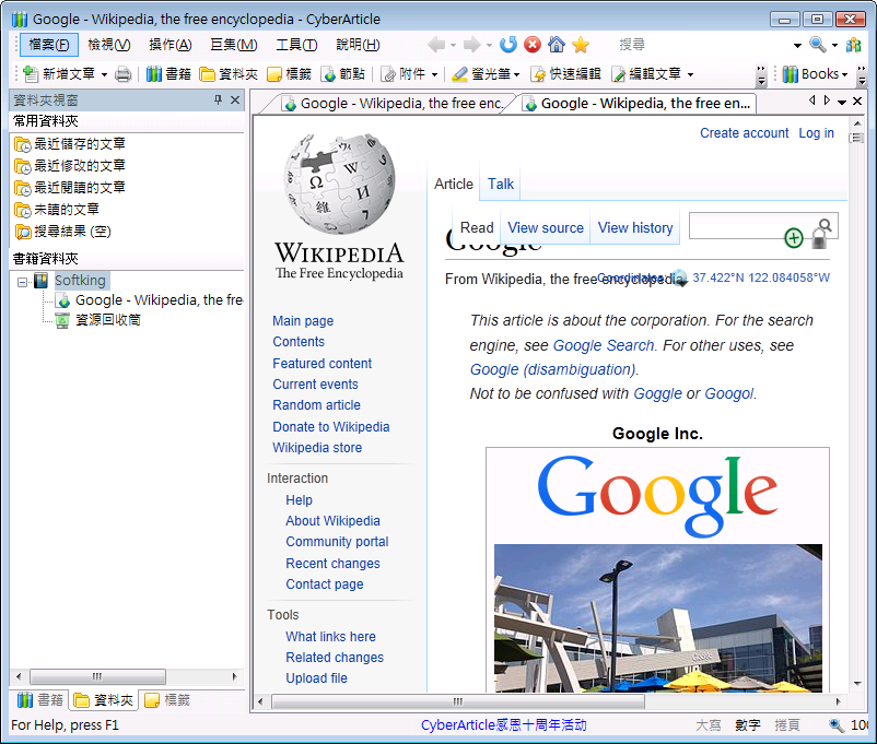當我們再開啟 CyberArticle 時,我們就可以發現 CyberArticl 已經將我們稍早的維基百科中的網頁儲存下來了。