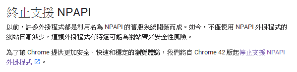 CyberArticle 原本與 Google 瀏覽器的整合性也是很高的。 但因 Google 瀏覽器自 V42 開始,將暫時停止支援 NPAPI 的外掛程式,並將於 V45 正式終止 NPAPI 的支援。 而 CyberArticle 正是採用 NPAPI 模式與 Google 瀏覽器進行整合。 目前(2015/08/07),Google 瀏覽器之最新版本為 V44,雖然仍可暫時啟用 NPAPI 的支援,但為日後更新版本的支援性,我們改採 CyberArticle Express 該模式,做為另一儲存網頁的解決方案。 Google 瀏覽器之官方說明網頁: https://support.google.com/chrome/answer/6213033?hl=zh-Hant