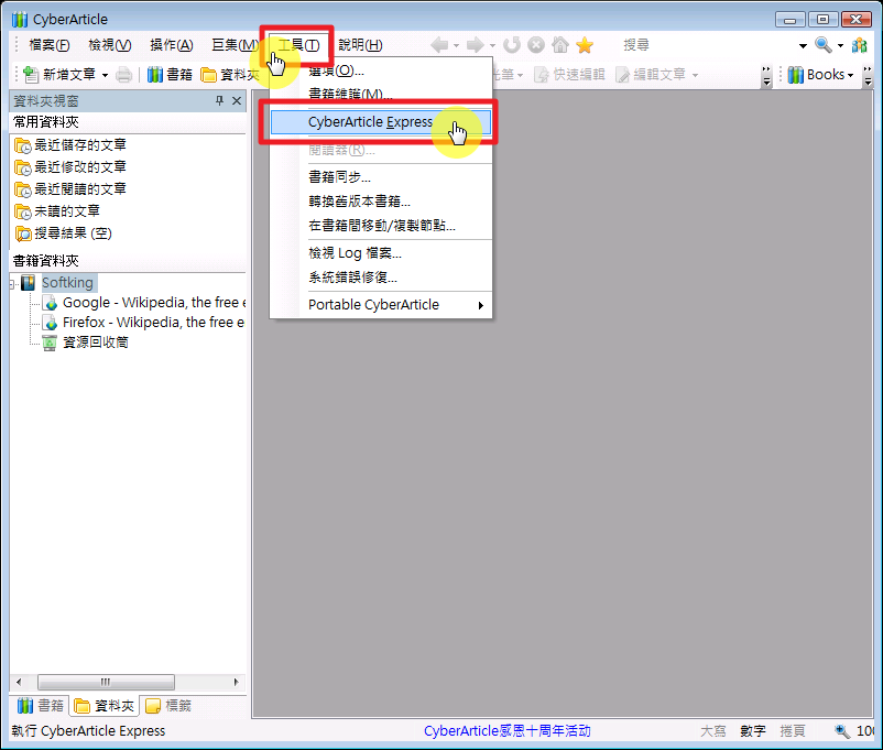 要開啟 CyberArticle Express 功能,要先開啟 CyberArticle 的軟體,並於上方功能列中找到「工具」,並點選其中的「CyberArticle Express」。