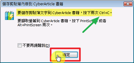 然後,我們會到這樣的訊息,這主要是讓我們知道該如何使用快速鍵功能,多數情況,我們只會用到複製功能。 所以請務必留意該視窗中的重點文字: 『按下兩次 Ctrl + C』 然後,再按下【確定】即可。
