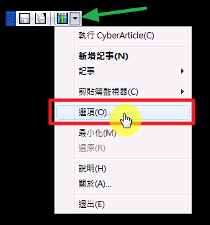 因為 CyberArticle Express 照正常情況,都要先開啟 CyberArticle 軟體主畫面去開啟該功能,所以我們可以讓 CyberArticle Express 隨機啟動,這樣就不需要每次要使用 CyberArticle Express 都要先開啟 CyberArticle。 先按下 CyberArticle Express 浮動工具列,最右邊的倒三角圖案,再點下「選項...」。