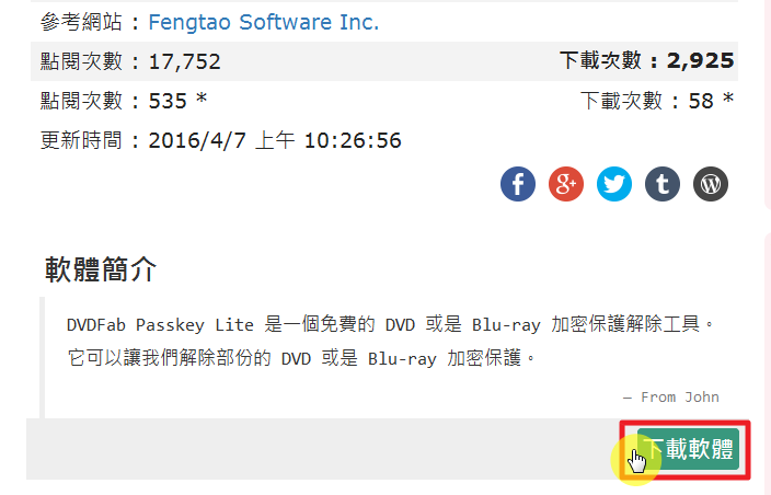 先至以下網址下載 DVDFab Passkey http://www.softking.com.tw/soft/?fid3=25754 DVDFab Passkey 是一個有限功能的免費軟體,雖然功能上會受到限制,但一般情況不會影響我們的使用。
