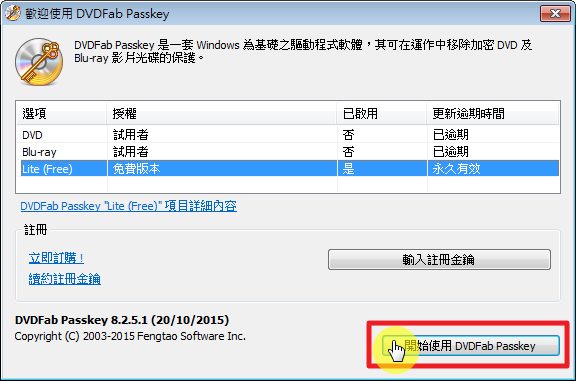 下載並安裝完畢之後,再啟動 DVDFab Passkey。然後再按右下的【開始使用 DVDFab Passkey】。 如果該按鈕呈灰色,無法點選的狀態。可以: