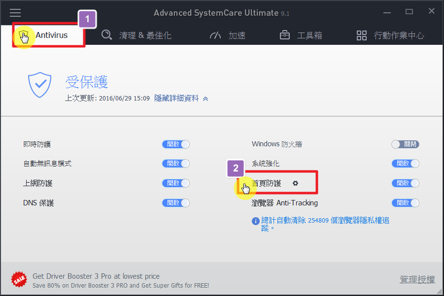 保護瀏覽器預設首頁,讓惡意軟體無法修改,提昇我們的安全。(IObit Advanced SystemCare Ultimate)