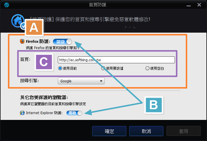 其中的『首頁防護』功能,可以讓我們的瀏覽器的預設首頁不遭到修改,包含我們自己。