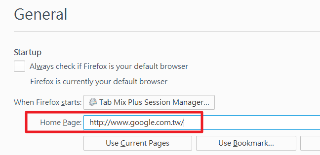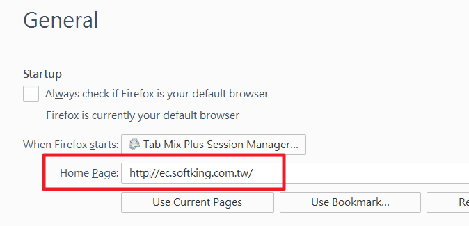 我們試著手動修改首頁網址。 將原本的 http://ec.softking.com.tw/ 修改為 http://www.google.com.tw/ ※ Firefox 的設定,一經修改會馬上生效,不需按下任何的「確定」、「儲存」或者類似功能的按鈕,因為事實上 Firefox 也沒有這些按鈕可以按。