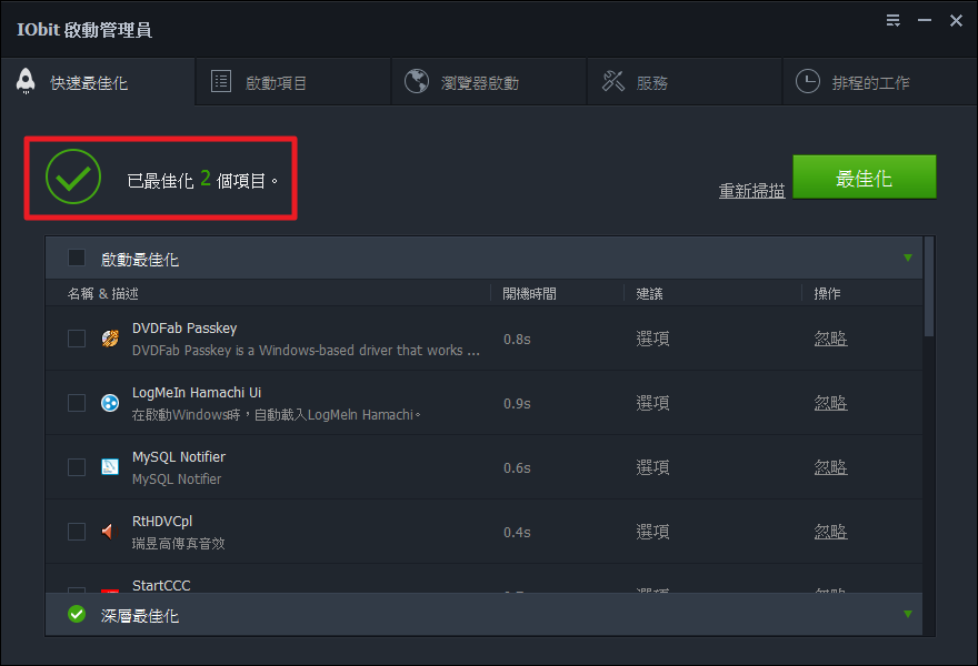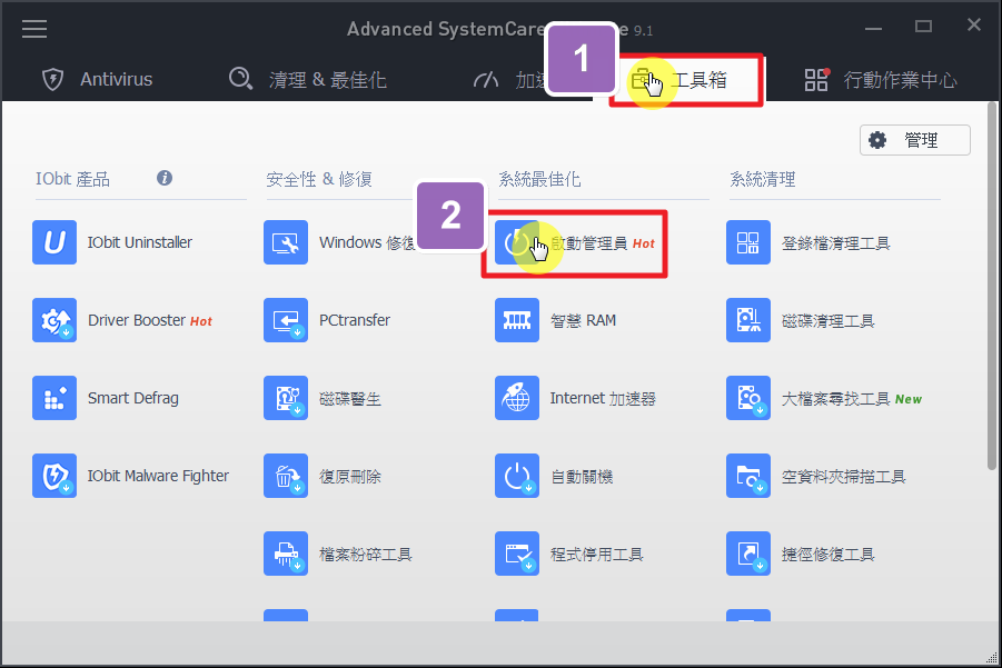 自動清理或停用不必要的啟動項目,加速電腦啟動速度。(IObit Advanced SystemCare Ultimate)