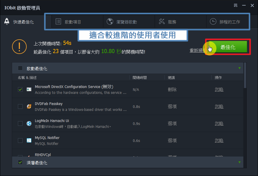 靜待一會兒,IObit Advanced SystemCare Ultimate 會出現它所掃描以及分析的結果。同時它會預先幫我們選取一些 IObit Advanced SystemCare Ultimate 認為可以停用的啟動項目。因為我們對電腦有些部份不是很熟悉,所以直接按下右上的【最佳化】即可。 ※ 如果是較進階的使用者,對於電腦有一定的熟悉以及瞭解程度,也可自行切換至其他分頁手動調整。