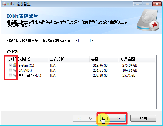 再來就要勾選要檢查的硬碟。 再按【下一步】。