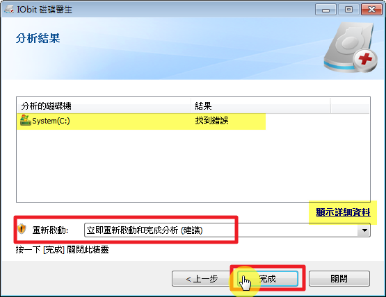 掃描完成後,可以發現有找到一些錯誤。 如果是進階使用者,可以使用『顯示詳細資料』來檢視一些掃描細節。 一般的使用者,在『重新啟動』這裡,可以選擇「立即重新啟動電腦(這也是建議值)」或者「在下次啟動電腦時掃描」。 最後再按【完成】。