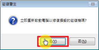 我們是選擇預設值,所以會出現詢問視窗。請注意,當你目前正處於工作狀態,請將你的工作存檔,因為當我們按下【是】之後,系統將會自動關閉所有程式,並重新開機,以進入掃描程序並嘗試修復這些錯誤。