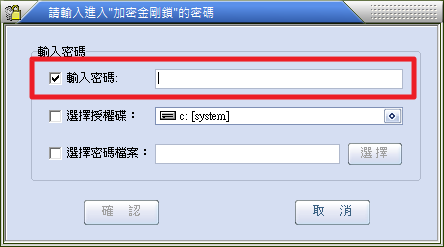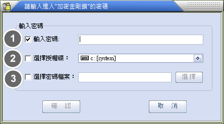 以加密金剛鎖的登入畫面做為例子來說(加密檔案或資料夾時也有相同選項),總共有三種認證方式: