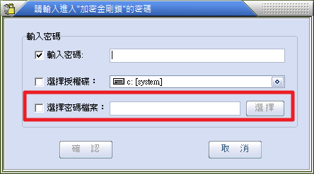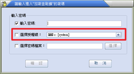 加密金剛鎖在初始設計時,已經想到了這樣的問題,也因此它不管是登入加密金剛鎖、加密檔案、加密資料夾……等模式,可以讓我們使用除了密碼之外的方法,它們分別「授權碟」以及「授權檔案」。