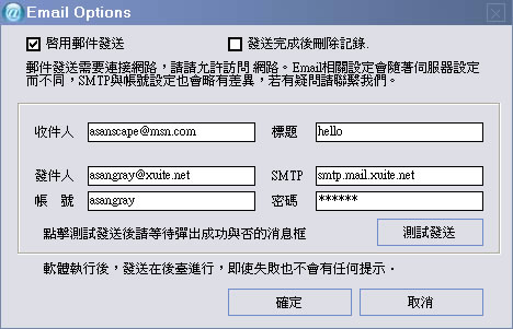 本軟體具備將指定記錄傳送至指定電子信箱功能。 選擇「選項設定」/「日程安排」/「郵件傳送」/「參數設定」進行傳送設定。注意發件信箱必須具備SMTP功能。如PCHome、Xuite等信箱較易設定。 中華電信部分信箱不支援SMTP,可向他們咨詢。一般來說,可用OutLook收發信件的信箱都支援SMTP。SMTP名稱(伺服器地址)各有不同,請洽信箱提供商。 一般地,abc.com的SMTP會是smtp.abc.com或mail.abc.com或smtp.mail.abc.com等。