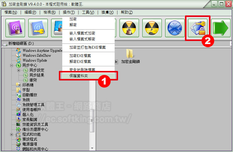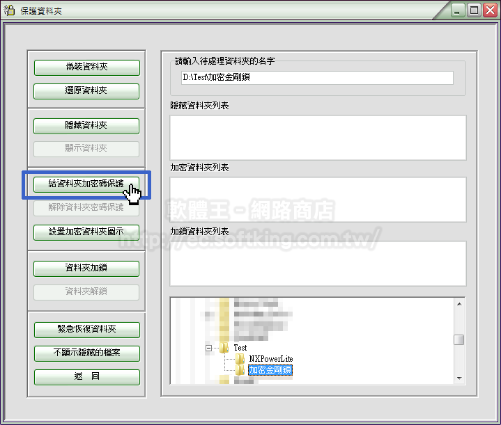 進入「保護資料夾」,於紅框處,尋找並選擇欲加密之資料夾,再點選左側之「給資料夾加密碼保護」,並為該資料夾設定一密碼即可。