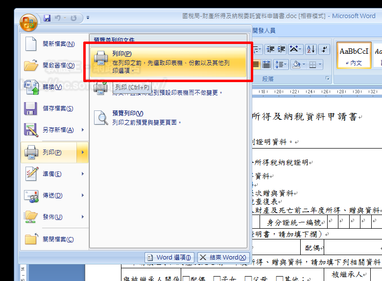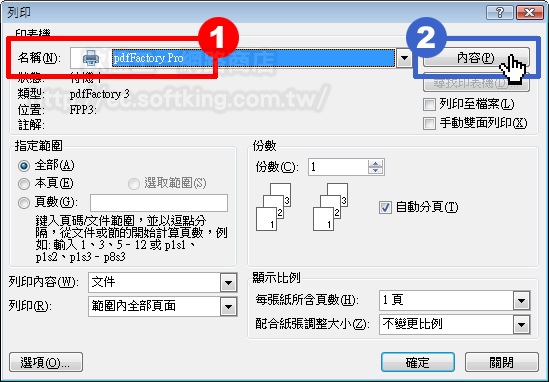 當我們已經安裝完 pdfFactory Pro 之後,我們並不需要很刻意地尋找它的蹤影,我們要使用它,只要依一般列印檔案的步驟就可以找到它的蹤影了,也就是「列印」功能。