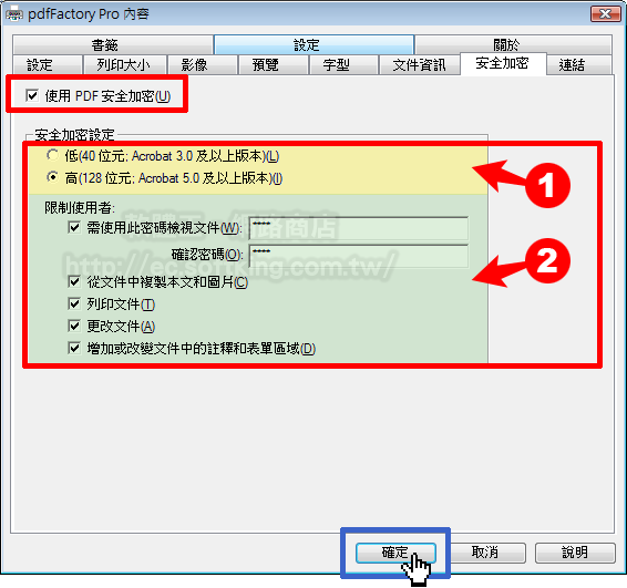 進入 pdfFactory Pro 的內容頁面後,我們切換至「安全加密」該分頁,並勾選「使用 PDF 安全加密」,即可看到下方藍框內之設定。
