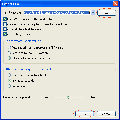 2-2 在導出FLA對話方塊,目標FLA檔案名默認保存為~snow.fla。你可以選擇重新命名。點擊“流覽”按鈕選擇保存檔的目錄。 然後選擇對應的屬性,確認“OK”。這時會彈出下列閃客精靈SWF Decompiler對話方塊。