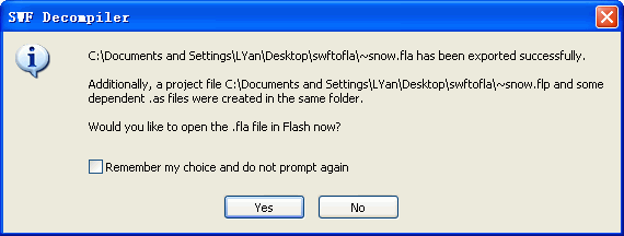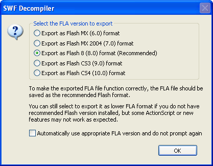 2-3 在上面的閃客精靈SWF Decompiler對話方塊內選擇FLA版本,確認“OK”。這時會彈出另一個閃客精靈SWF Decompiler對話方塊,如下: